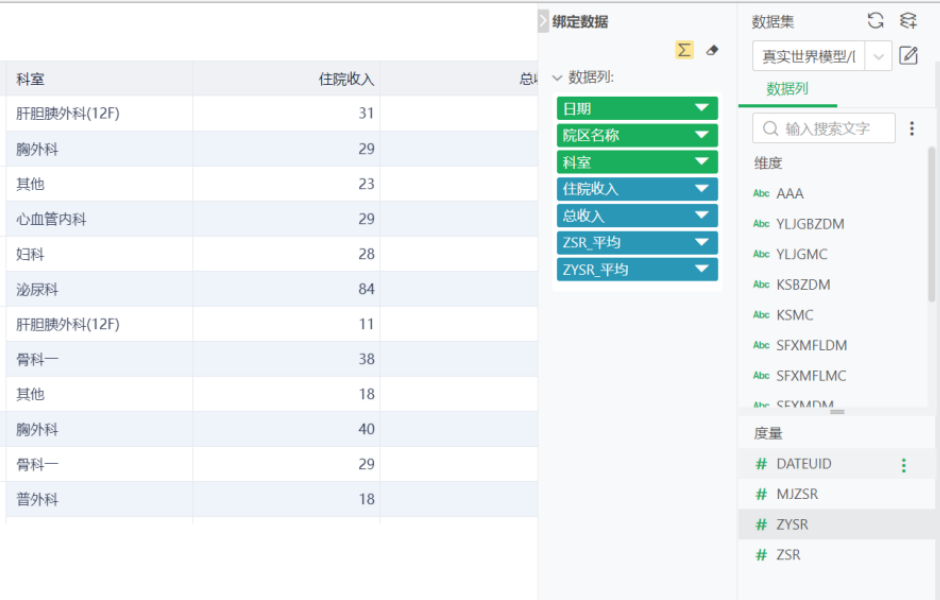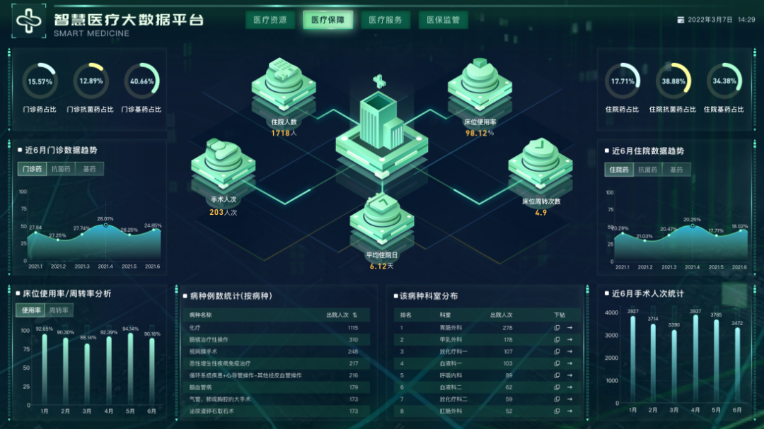 通过自定义选择维度、度量(指标),聚焦关注重点,平台可实现不同维度、层次、指标的信息资源查询,自动生成报表、图表(饼图、柱状图、趋势图、雷达图等)。以住院主题为例,可选的维度包含:时间、院区、科室、病区等;可分析的指标包含:收入构成、出入院人次、手术量,平均床日等。通过各种维度、指标的综合分析,建立起可视化的数据库。