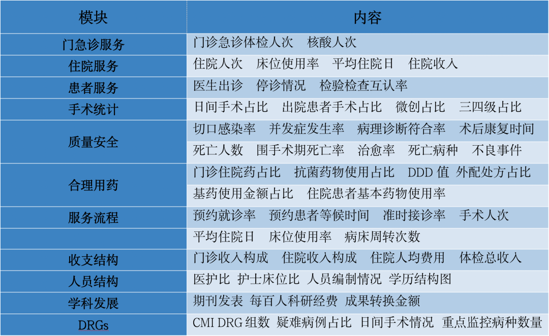 科室及医疗组决策支持平台可为科室管理者及临床医生提供决策支持,快速掌握科室运营数据,发现经营决策问题。平台利用大数据分析技术,并结合当前业务现状,实现对已归集历史数据的合理使用,对业务关键指标以仪表盘、柱状图、饼状图、折线图、进度图等方式进行展示,为科室管理者全面掌握当前业务现状、后续学科发展决策、制度修订等提供数据支撑和服务;通过展示围绕门急诊服务、住院服务、质量安全等模块数据支持(如表1所示),帮助医院管理者从指标中发现、查询、分析问题,利用业务报表陈述业务事实,预警监控反映业务状态[3],为科室合理、高效开展业务以及工作重心调整等提供了充分的信息化手段,助力实现管理精准化和服务高效化。