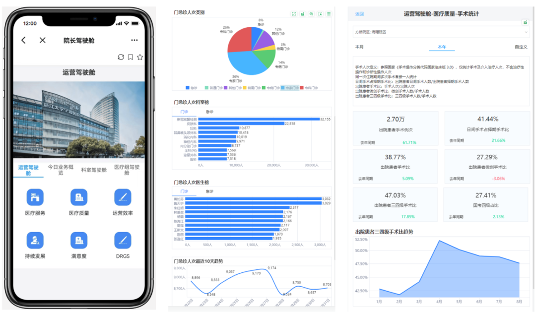 宁波市第一医院的智慧运营分析平台建立了“5G移动驾驶舱”实现数据随时看,建立了“手机钉钉驾驶舱”,围绕医院内部管理和患者服务进行建设,优先医院内部管理,有助于医院管理层实时查看医院运营状况。