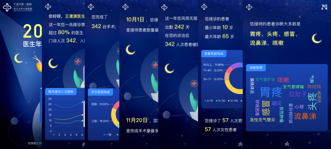 其中,“医生年报”包括工作量统计、患者信息统计、重点时刻统计、结尾总结四个维度;“工作数量”包括病患者数量、接收门诊人次数量、收治住院人次数量、手术数量、健康出院人数等维度;“患者信息”统计医生收治患者分布,包括患者年龄区间范围、年龄阶段分布、患者男女占比等;通过数据展示医生年度“重要时刻”,如接诊患者数量最多的一天、完成手术数量最多的一天等,全方位展示医生年度工作量。针对各具特色的医生年报,医院授予其不同称号,例如“勤劳楷模”、“手术达人”、“最受年轻人喜爱”、“最受老年人喜爱”等,详见图6。