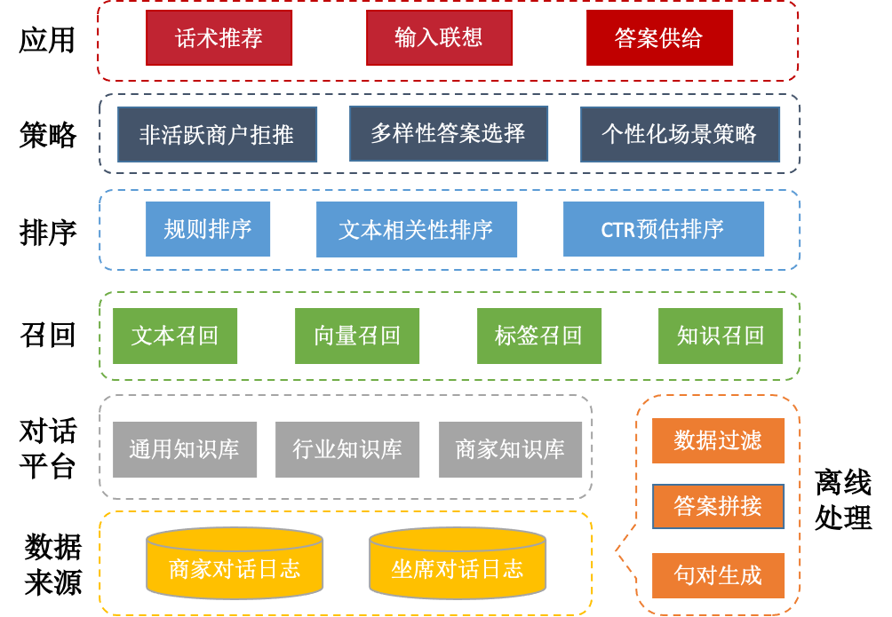 数据与平台层:离线对坐席/商家与用户的历史对话Session进行清洗、处理,建立自动化流程,日更新话术索引库。同时,利用对话平台构建知识库,既可以用在智能客服中,也可以用作话术推荐。 召回层:给定对话上文及其它限制条件,从话术索引库和知识库中召回结果,包括文本、向量、标签、知识等多路召回。 排序层:针对召回模块返回的结果集合,进行排序打分,包括规则排序、文本相关性模型排序以及CTR预估排序。 策略层:针对排序模块返回的结果列表,进行重排序或者拒推,例如非活跃商户拒推,推荐列表包含正确答案而商家长期无采纳行为则降低推荐概率;多样性答案选择,尽量选择语义及表达形式不同的答案,避免推荐过于相似的答案;个性化场景策略,针对场景特征定制策略。 应用层:主要用于人工辅助场景,包括在线回复咨询时的话术推荐和输入联想,以及离线填答智能客服知识库时的答案推荐供给。