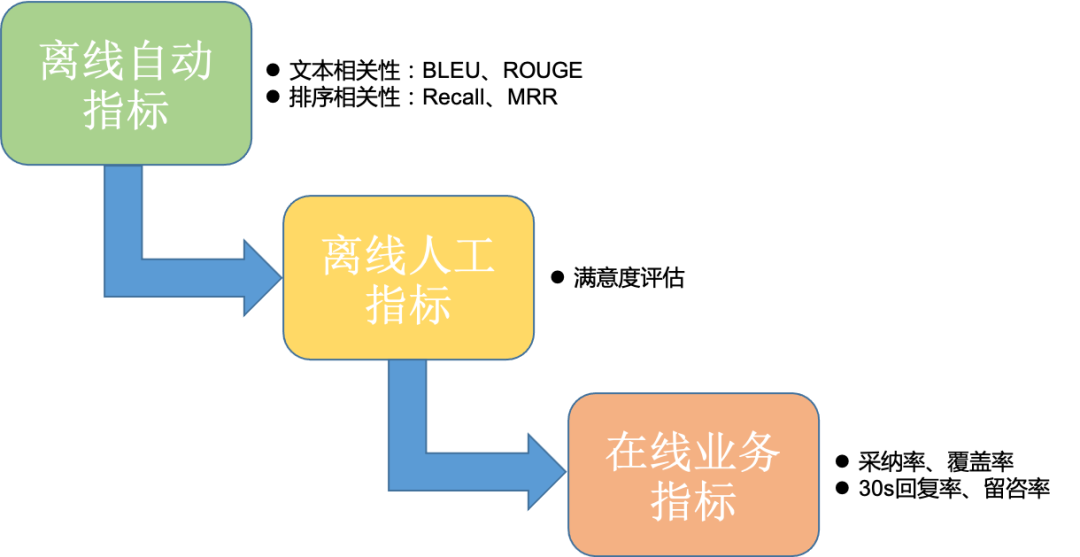 同时,为了更合理地指导系统相关优化,我们设计了一套离线到在线的指标体系,以话术推荐为例,如下图2所示,具体来说可分为三个部分: