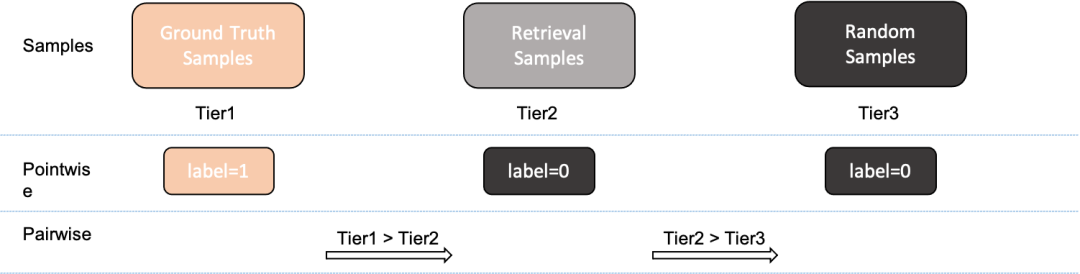 曝光列表(View,False or Hard Negatives):曝光未点击,上一版精排模型的排序Top-3结果集合,存在精排模型偏置。 召回列表(Retrieval,Hard or Common Negatives):召回模块返回的样例集合,线上精排模型的输入全集,存在召回模型偏置。 随机话术(Random, Easy Negatives):该商户过去一个月发送过的句子集合,以及商户所属二级类目发送的高频句子集合。