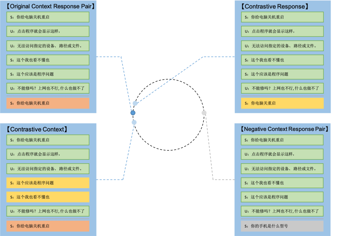 Context-Response Pair:经由历史对话日志挖掘得到的样本对,及给定上文和其对应的回复。 Context-Context Pair:借助商户Context与Response的对应关系,同一Response对应的Context集合互为正例,通过这种关系伪造获取Context及其对应Context。