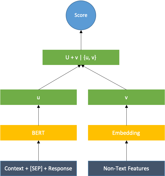 排序模块是在上一步召回模块的基础上,结合当前的对话上下文对每个召回的答案进行打分排序。在召回阶段,为了能够更高效率的进行检索,我们通常采用的是双塔架构模型,这种模型Context与Response信息交互的程度低,效果相对也较差。而在排序阶段,召回的候选集通常已经控制到了几十条,可以利用交互式架构模型,来更好的学习Context与Response之间的相关性,从而提升话术推荐的准确性。
