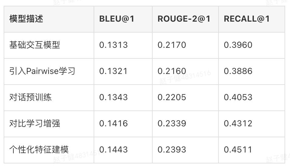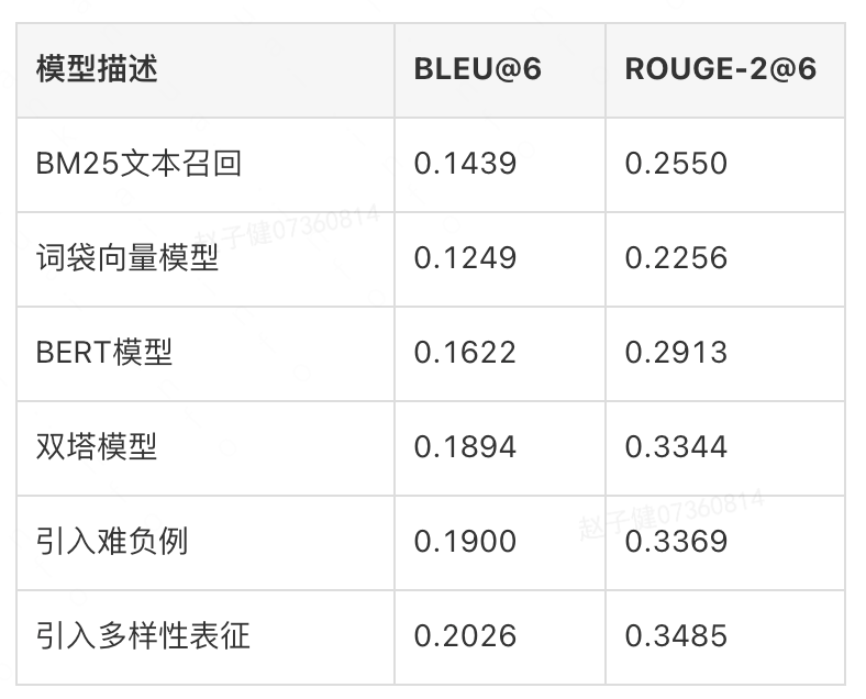 精排模型主要考虑Top-1排序结果的BLEU、ROUGE2、RECALL指标,结果如下表所示: