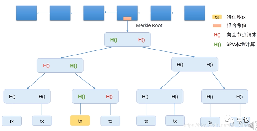 我需要黄色的transaction(交易)信息,但是我不希望每次都将整个tree下载下来进行辨别。交易对方给我提供红色的全节点请求,我通过这些节点,从底向上的验证出来root hash即可