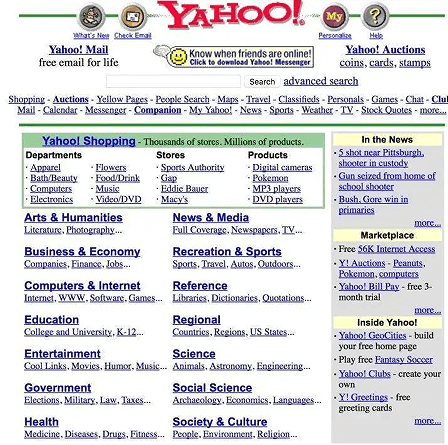 限于当时的网速和技术的限制,人们对互联网的使用也就是浏览各种信息,网页是也比较简陋,比如Yahoo网站: