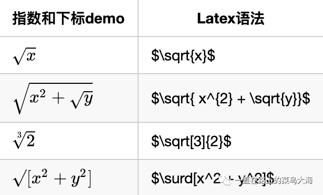 2、平方根(square root)的输入命令为:\sqrt,n次方根相应地为:\sqrt[n]。方根符号的大小由LATEX自动加以调整。也可用 \surd 仅给出符号。比如: