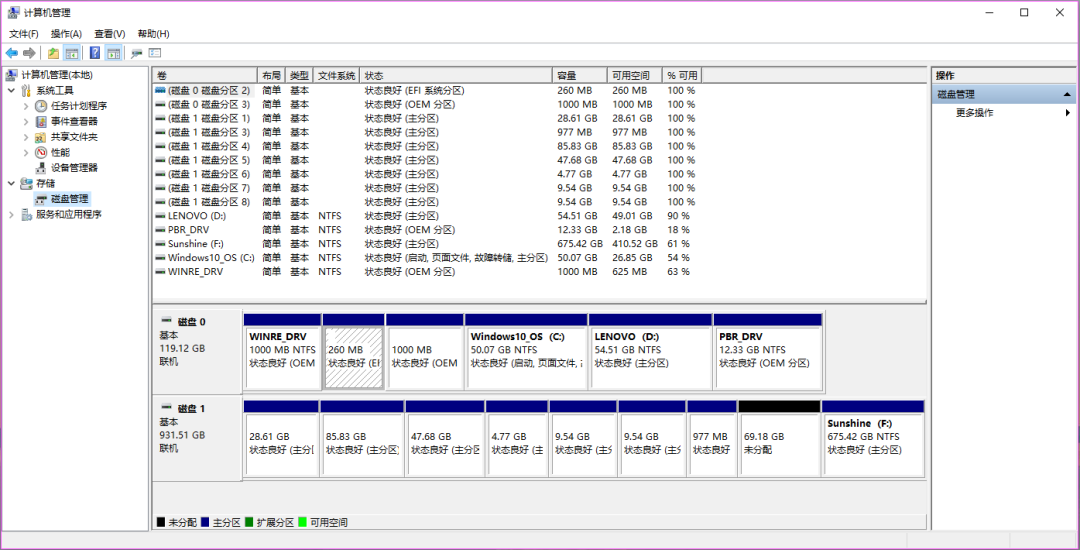 1)鼠标右键计算机,在弹出来选项卡中选择管理,接着在弹出来的窗口左侧点击 存储/磁盘管理,进入磁盘管理界面,如下图所示: