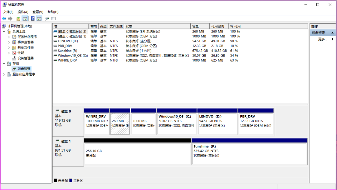 2)在你要安装的目标磁盘中,通过删除卷和删除分区操作腾出一块未分配的磁盘空间作为安装区,我要安装的位置是 磁盘1,所以我在 磁盘1 中整合出了 256GB 的空间用来安装 Ubuntu18.04.1(安装区的大小依磁盘总的空间以及你的需要而定),这一步弄好后如下图所示: