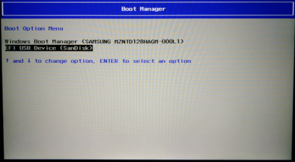 我们选择Boot Menu,在其中的Boot Manager界面中选择 EFI USB 作为启动项,回车。