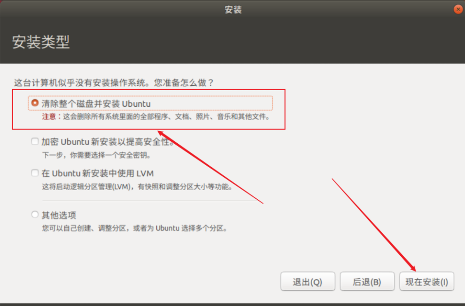 ⑤安装类型:第一个选项会比较省事,系统自动分区,最后一个选项则需要手动分区,如果你是第一次安装推荐选择第一个选项,笔者当时选择了手动分区,研究了好久最后还是白白浪费了好多内存……
