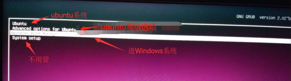 重启后你会看到以下界面,第一项是ubuntu启动项,第二项是ubuntu高级设置,第三项是windows启动项,第四项不用管,默认选择的是第一个,回车进ubuntu系统。