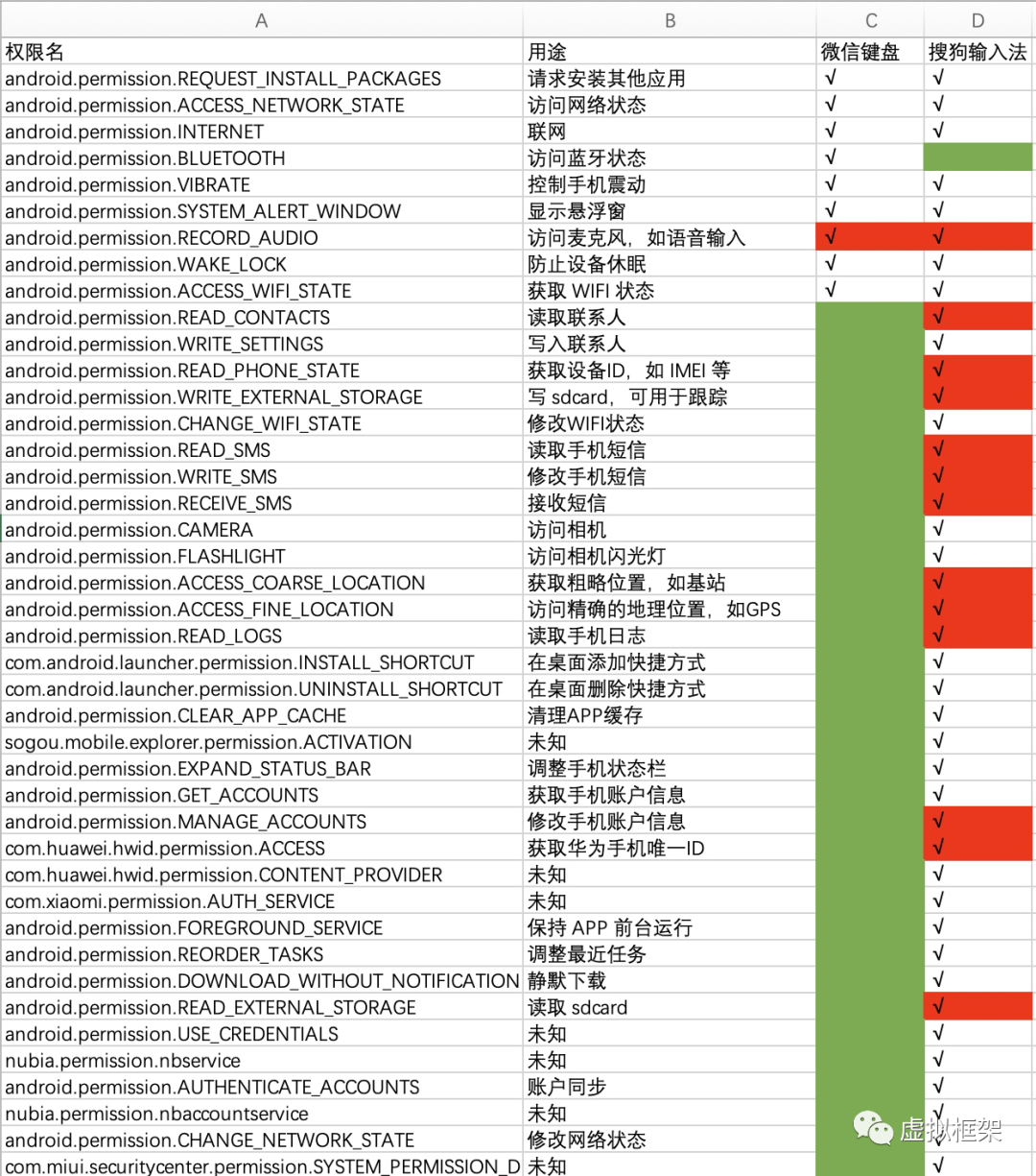 通过上面的表格可以看到,微信键盘总共申请了 9 个权限,搜狗输入法申请了 41 个权限;其中比较高危的权限我用红色标记了出来: