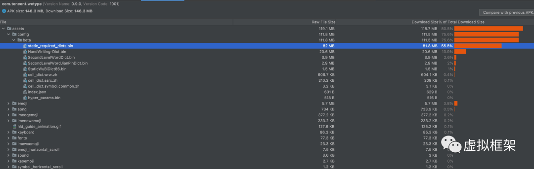 从上图可以看出,微信键盘安装包约 150M,里面 80% 的空间存放的是它的本地词库!!