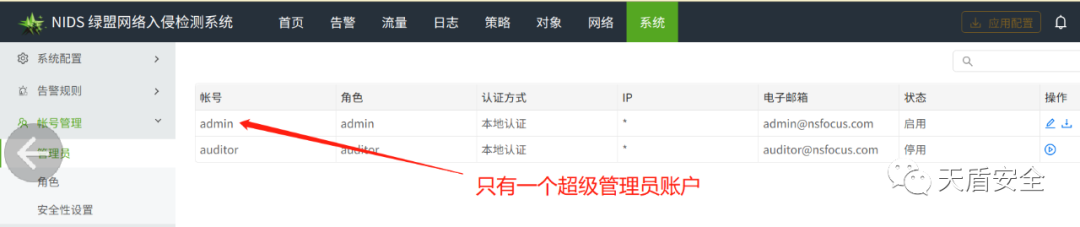 上图可以看出该设备只有一个admin账户,审计账户未启用,且admin未超级管理员,明显未限制admin的访问权限。 b) 应重命名或删除默认账户,修改默认账户的默认口令;