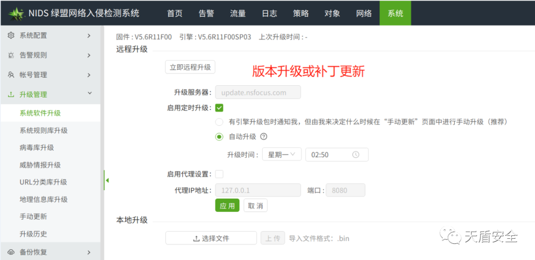 上图可以看出该设备可以直接在设备上配置管理员的登录地址,有的设备登录地址无法在设备自身设置,可在防火墙以及其他具有访问控制功能的设备上设置。 d) 应提供数据有效性检验功能,保证通过人机接口输入或通过通信接口输入的内容符合系统设定要求; 安全设备该测评项不适用。 e) 应能发现可能存在的已知漏洞,并在经过充分测试评估后,及时修补漏洞;