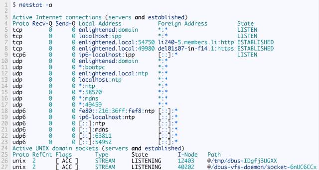 Netstat 是一款命令行工具,可用于列出系统上所有的网络套接字连接情况,包括 tcp, udp 以及 unix 套接字,另外它还能列出处于监听状态(即等待接入请求)的套接字。如果你想确认系统上的 Web 服务有没有起来,你可以查看80端口有没有打开。以上功能使 netstat 成为网管和系统管理员的必备利器。在这篇教程中,我会列出几个例子,教大家如何使用 netstat 去查找网络连接信息和系统开启的端口号。