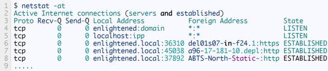 第一个要介绍的,是最简单的命令:列出所有当前的连接。使用 -a 选项即可。