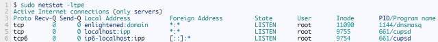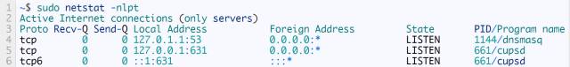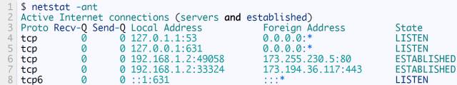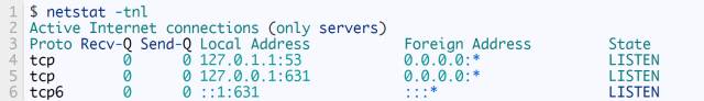 现在我们可以看到处于监听状态的 TCP 端口和连接。如果你查看所有监听端口,去掉 -t 选项。如果你只想查看 UDP 端口,使用 -u 选项,代替 -t 选项。