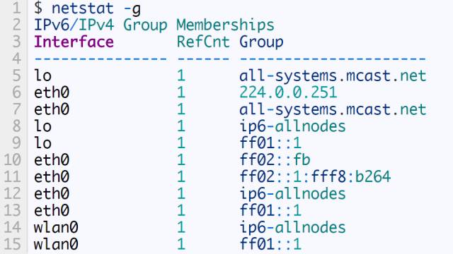 选项 -g 会输出 IPv4 和 IPv6 的多播组信息。
