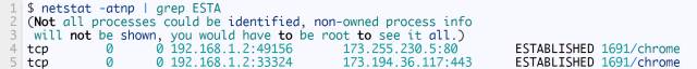 active 状态的套接字连接用 “ESTABLISHED” 字段表示,所以我们可以使用 grep 命令获得 active 状态的连接: