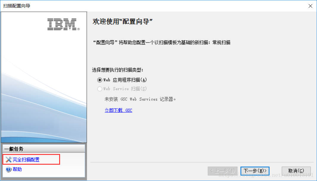 3)点击【完全扫描配置】到扫描配置页面,AppScan支持web service项目的安全检测,但是需要先按照GSC