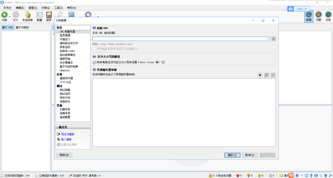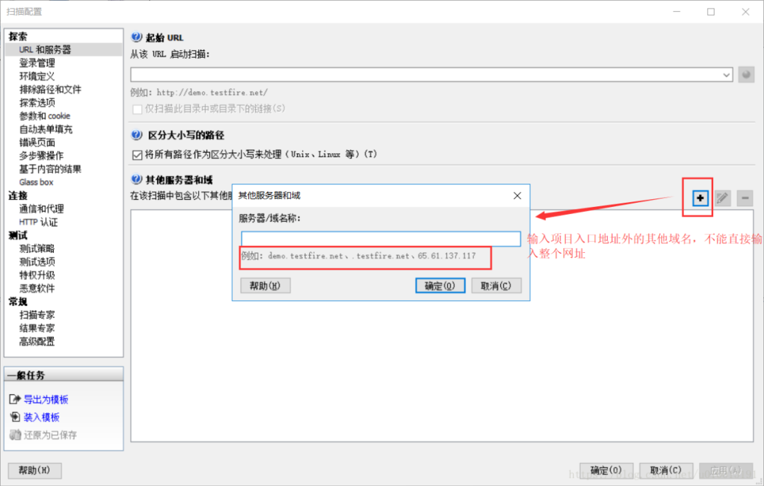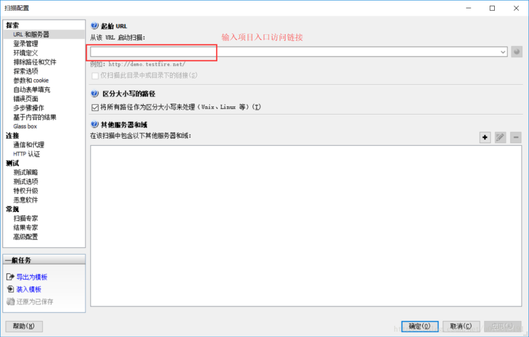 4)扫描配置-URL和服务器:起始URL输入我们要扫描网站的地址,如果网站还包含其他域名,则在其他服务器和域进行添加