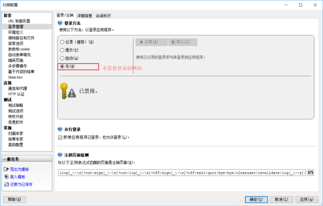 5)扫描配置-登录管理:扫描的网站不需要登录则登录方法选择无即可;