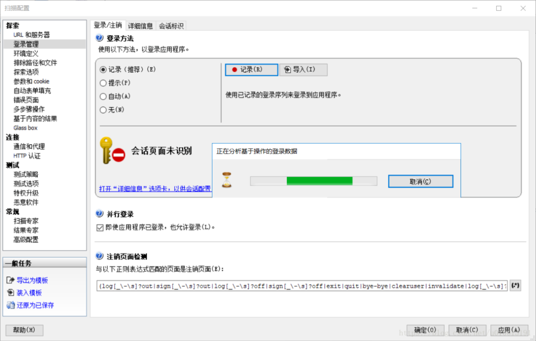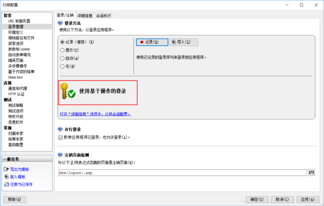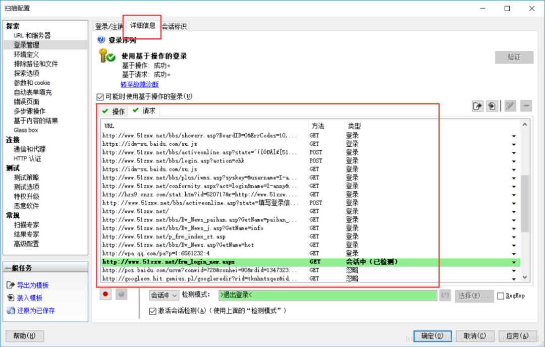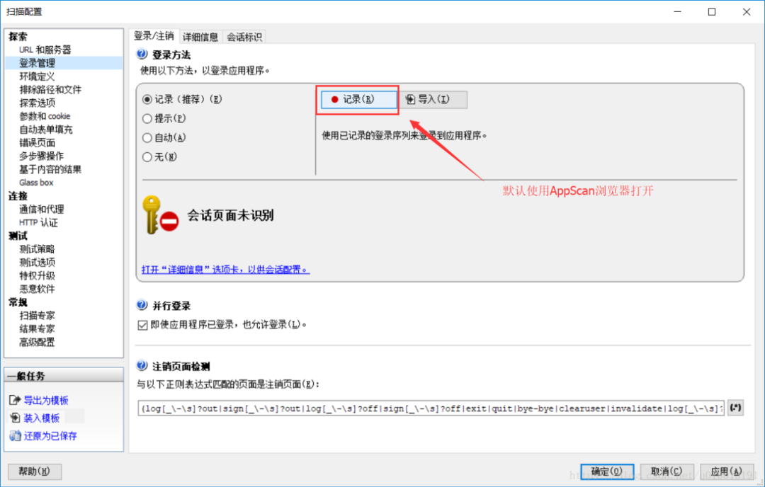 若需要登录,则点击【记录】,默认使用appscan浏览器打开网站,输入账号密码登录成功后,登录序列就会被记录。