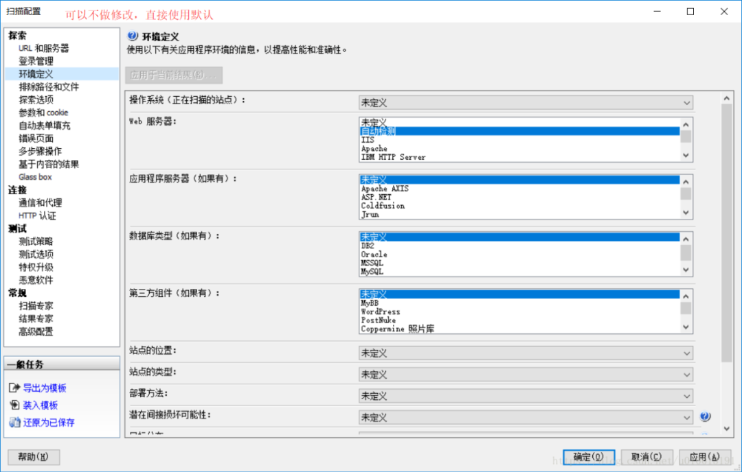 6)扫描配置-环境定义:如果知道系统使用的环境可以自己定义,不知道则使用默认。