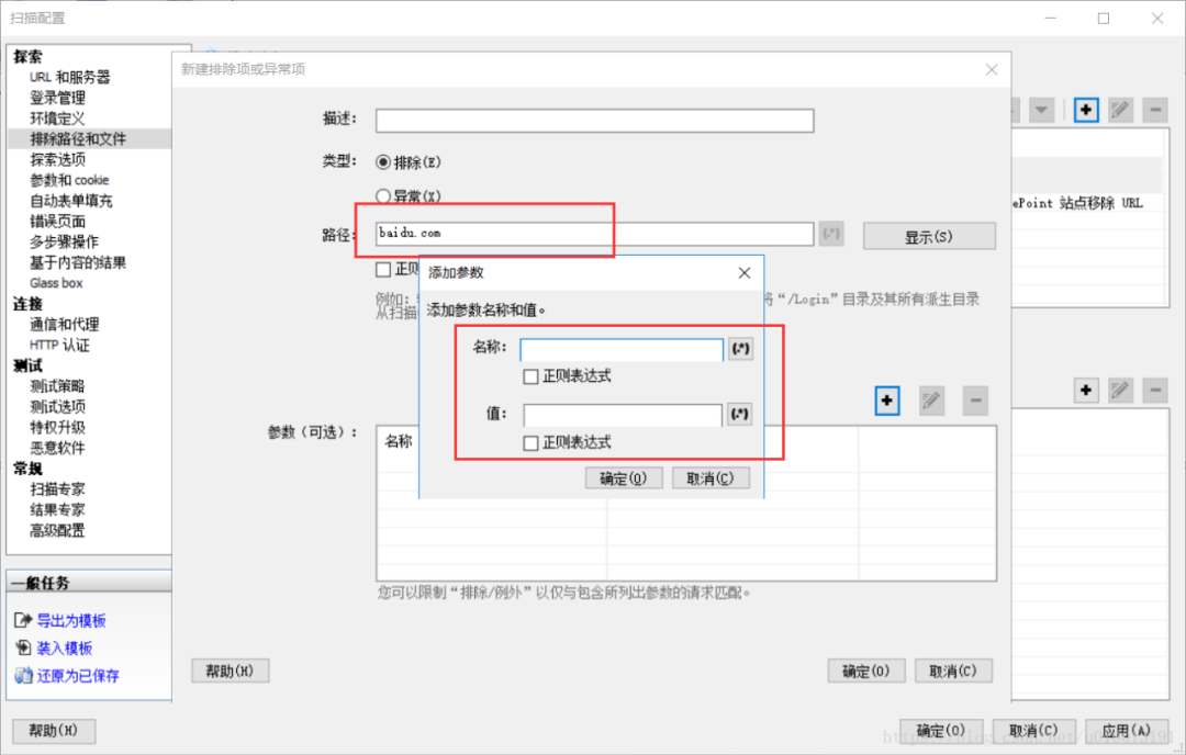 7)扫描配置-排除路径和文件:对一些不需要的网址、图片、文件或者会影响扫描的网址做一个过滤操作。(可能会提高扫描速度和效率)