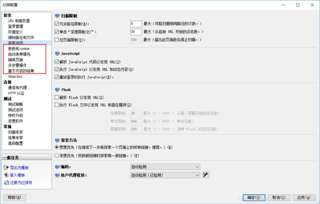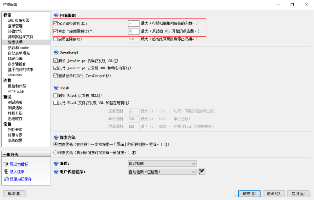 8)扫描配置-探索选项(冗余路径和深度路径可以进行适当的设置,其他选项可选择进行设置或者全部使用默认)