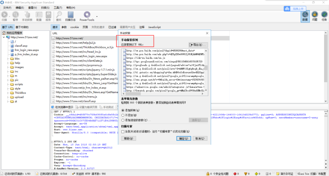1)在打开的页面中点击需要测试的页面,完成后,点击【暂停记录】按钮后关闭页面,会弹出手动探索序列对话框(包含手动点击页面的URL链接)