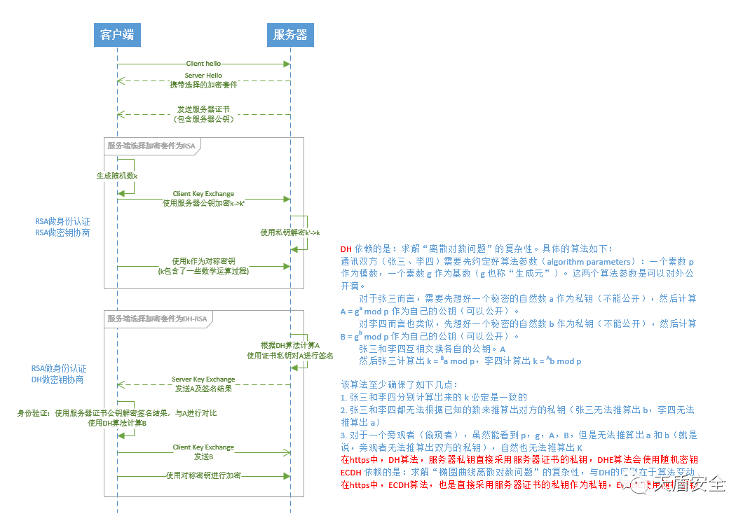 DH类算法 通过 "求解离散对数问题" 保证安全性 只能防监听,不能防篡改,所以一般会结合非对称加密算法(RSA,DSA,ECDSA)等做加密