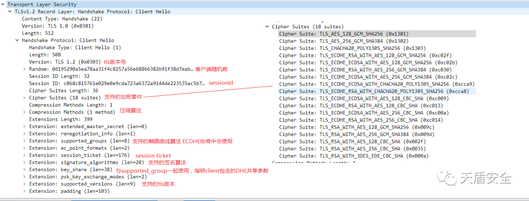 Client Hello 发送客户端支持的加密协议 及TLS版本 客户端随机数