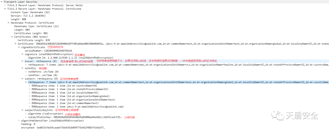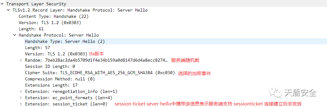 Sever Hello 发送服务器选择的加密协议及选择的TLS版本,服务器随机数
