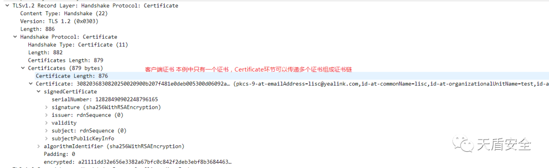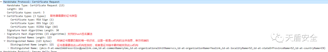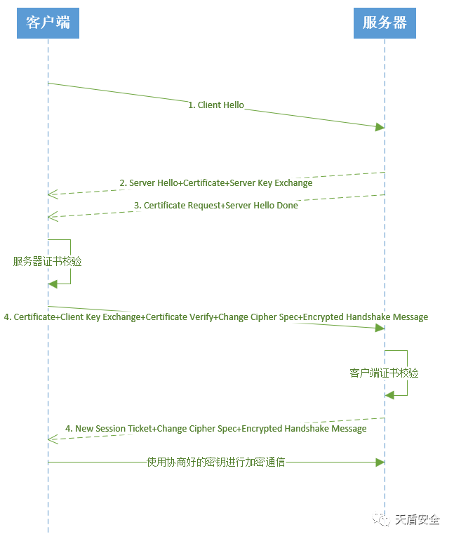 双向认证过程中的大部分步骤是相同的,只是多了服务器请求客户端证书以及客户端发送证书及签名的过程,这里仅解释不同的部分: