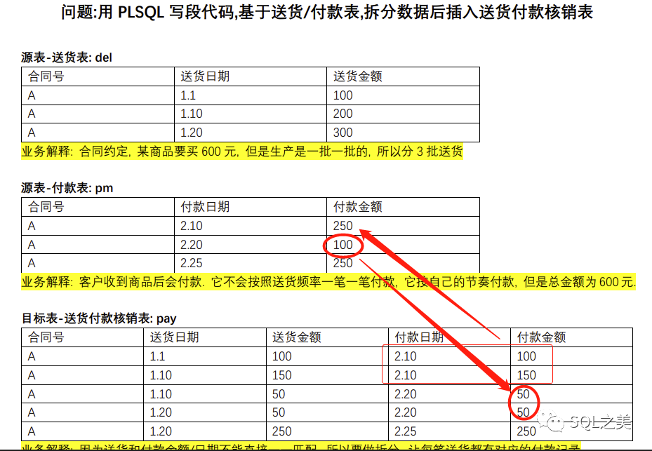 将DEL和PM表合并插入到pay表,依据PM表的付款金额和DEL的送货金额进行数据拆分重组,