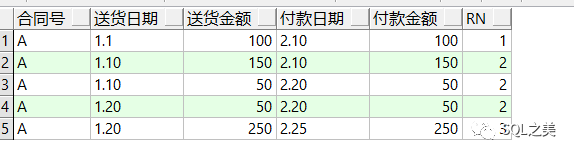 第五条记录 送货日期 +付款日期取 DEL+PM表第三行记录,送货金额+付款金额=第三条付款金额