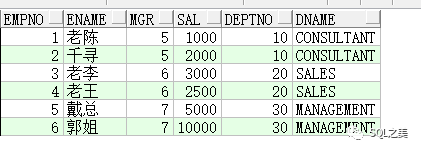 from (select 1 as empno, 5 as mgr, '老陈' as ENAME, 1000 as sal, 10 as deptno from dual