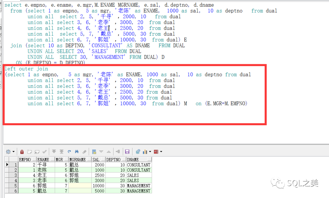 当我们想要查询每个员工的经理名字时,将再次生成新的union all 关联结果,让正常的查询变得更加冗长