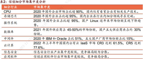 信创产业不同细分行业市场集中度差异较大。其中CPU、存储芯片和操作系统领域市场基本处于国外企业寡头竞争格局,市场集中度较高。云计算领域国产化程度较高,呈现国产企业寡头竞争格局;数据库和中间件领域市场集中度中等偏高;信息安全和应用软件领域细分行业参与竞争企业较多,市场集中度相对较低。