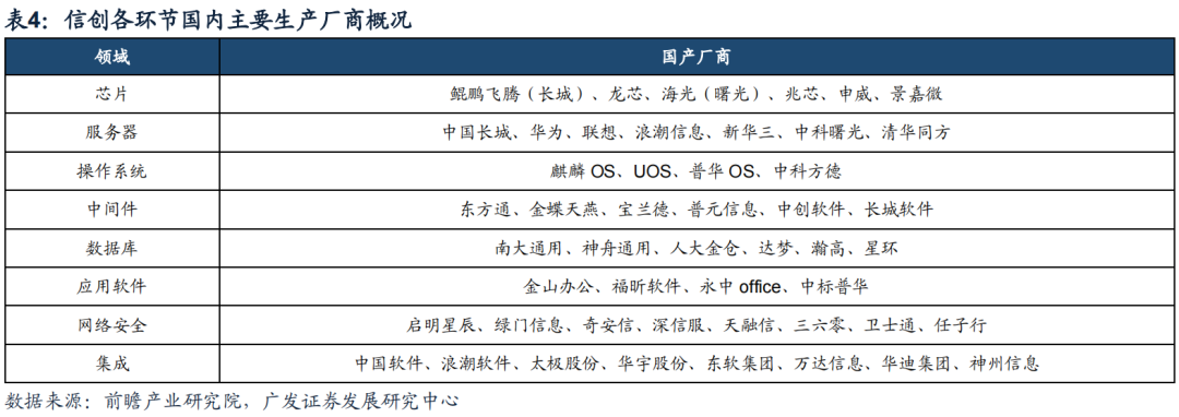 信创产业机遇四大主线:基础硬件、基础软件、应用软件、网络安全信创产业链主要由基础硬件、基础软件、应用软件及网络安全组成。基础软硬件自主可控是实现信控的基石,其中基础硬件主要包括芯片、服务器、存储等,基础软件包括操作系统、中间件、数据库等。应用软件及信息安全自主可控打造信创闭环,其中应用软件主要包括办公软件、OA等,信息安全包括终端及边际安全产品。基于当前各行业进展,我们建议优先关注基础硬件(芯片/服务器)、基础软件(操作系统/数据库)、应用软件(办公软件)、网络安全(终端安全软件)。