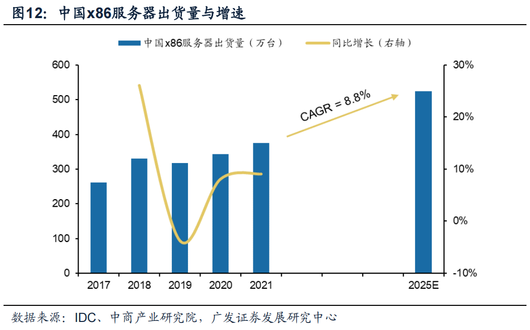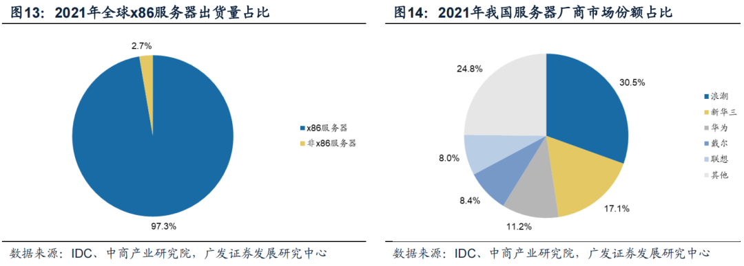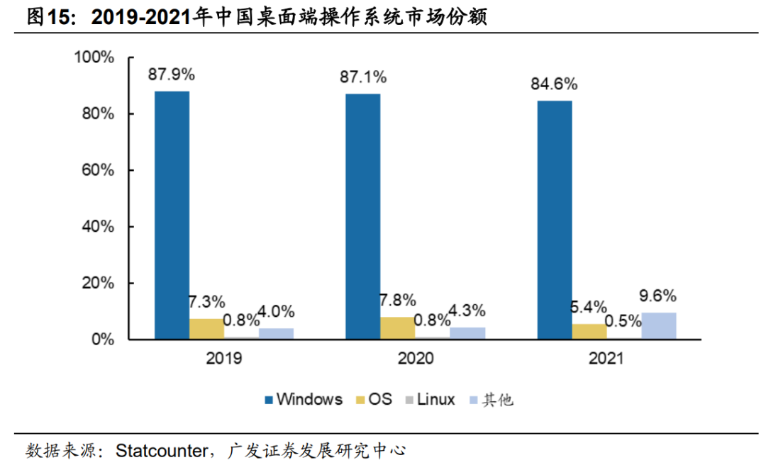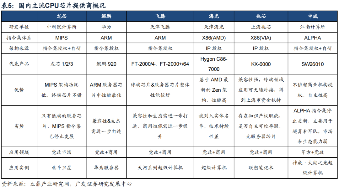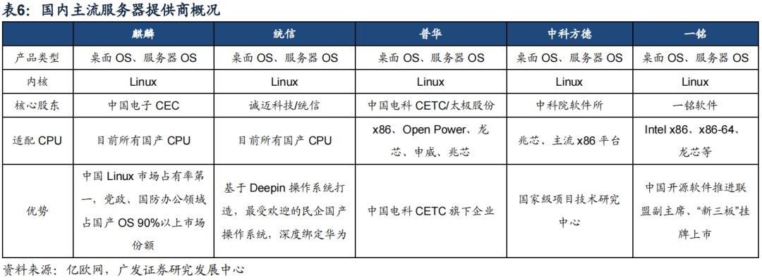CPU芯片国产替代迫切性高,部分国产厂商已具备替换能力。①市场供给上,我国芯片对外依存度较高,新发展格局下属于卡脖子“补短板”关键领域,国产替代迫切性更高。据海关总署统计数据,2021年集成电路进口额高达4333亿美元,同比增长23.3%,仍是进口的“最大单一类商品”。②竞争格局上,市场主要由Intel和AMD双寡头垄断,近年来安全可控带来鲲鹏、飞腾、龙芯等国产CPU芯片快速成长;③政策上,美国对华为芯片供应等限制、政府层面“2+8”安全可控体系、推动国产化采购、对符合条件厂商实行优惠政策等措施进一步助力CPU芯片国产化;④国产生态上,国内厂商大多借助指令集授权或IP授权方式获取技术并进行CPU研发设计,目前申威、龙芯已基本实现自主可控,主要用于超算、导航卫星等军方及党政领域,商业化运用不足;鲲鹏、飞腾拥有ARMv8指令集架构永久授权,自主可控程度较高,且商业化程度较好,有望率先实现规模化。服务器需求端招标确定性高,订单增长后业绩潜力强。①市场规模上,IDC数据显示,2021年全球x86服务器出货量占比97.3%,预计2021-2025年中国x86服务器出货量复合增长率达8.8%;②竞争格局上,2021年浪潮、华为、新华三占据服务器市场超过一半的市场份额;③市场需求上,今年以来,金融、电信领域逐步开始服务器国产替代。根据中国农业银行官网数据,中国农业银行于2020年采购了2000台华为TaiShan服务器。随下游5G、IDC、云计算大规模落地,国产服务器市场有望迎来进一步提升。国产替代具备一定迫切性。①竞争格局上,当前市场主要由外资厂商如微软、谷歌垄断。Statcounter对全球所有平台操作操作系统的统计显示,截至2022年9月,Andorid占比43.06%,Windows占比29.39%,iOS占比17.85%;②国产生态上,统信UOS系统及麒麟OS具备相对完善生态圈,已研发出多款操作系统,但由于基于Linux系统,配套PC软件不足,短期内在商用领域难以与Windows形成有力竞争;③国产替代上,由于Win7于2020年1月14日起终止服务,2021年Windows、OS和Linux以外的其他操作系统在中国桌面端操作系统市场中的份额达到9.6%,较2020年有明显提升,国产替代成效开始显现。此外,由于操作系统大部分核心技术、厂商及产品均起源于美国,存在贸易管制风险,因此对于该类“卡脖子”产业国产替代具备一定迫切性,但由于暂无相关进出口管制且当前国产操作系统基于Linux缺乏市场生态,因此迫切性相对弱于CPU芯片。