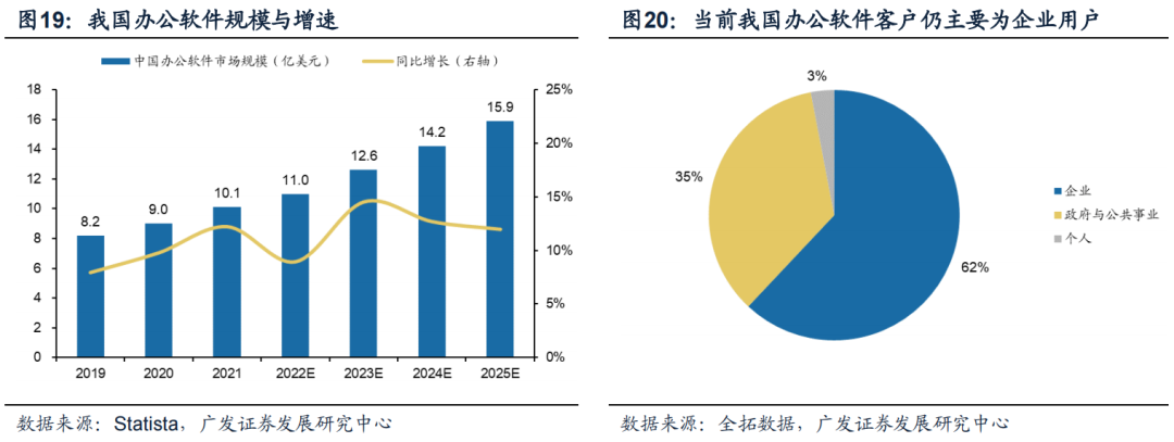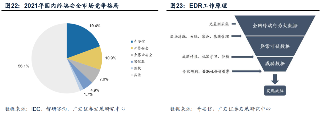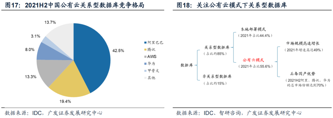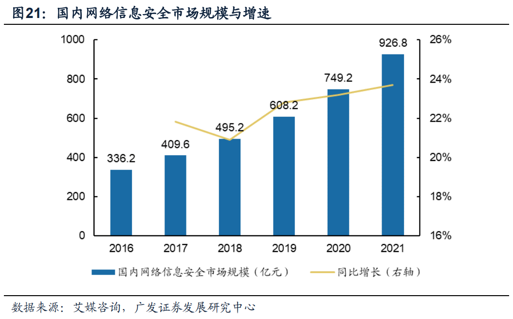 新基建拉动下,国产数据库受益确定性高。①规模上,据中国信通院《数据库发展研究报告(2021年)》测算,到2025年,中国数据库市场规模将达688亿元,2021-2025年的复合增长率为23.4%;②成长动力上,新基建的逐步推进将带来数据量的井喷,因此数据库作为数据的载体,受益确定性高;③国产落地上,近月以来国产数据库热度持续上升,除去各大金融政企上线国产数据库外,国内数据库产品水平不断提升。2020年腾讯推出全新版本腾讯云MySQL 8.0,随后华为推出两大云原生数据库新品GaussDB (for MySQL)和GaussDB NoSQL;④细分领域上,建议关注公有云关系型数据库,智研咨询数据显示,2018年关系型数据库占市场85%。根据IDC最新报告,2021年中国关系型数据库市场规模达到27.7亿美元,同比增长36%;其中,公有云关系型数据库规模达15.4亿美元,同比增长49%,占数据库市场的比例达到55.6%。IDC预计,我国关系型数据库软件市场将保持高速增长,2021-2026年复合增长率为28.1%。在公有云关系型数据库市场上,阿里及腾讯占据超过一半的市场份额。应用软件与行业数据结合紧密,国产替代是数据安全必经之路。①规模上,Statista数据显示,2021年中国办公软件市场规模突破10亿美元,2025年有望达到15.9亿美元,2021-2025年复合增长率为12.0%,远高于全球市场的增速。②下游客户上,我国办公软件主要客户为企业及政府、公共事业用户,家庭与个人占比仅3%;③国产生态上,以WPS为代表的办公软件技术较为成熟。截至2020年,WPS在国务院组织机构中的覆盖率达到95%,央企覆盖率为96%,中大型银行覆盖率为87%。艾瑞数据显示,截至2022年6月,WPS在国内PC端的总体覆盖率达到68.7%,较2020年底提升超过8个百分点。国产终端安全软件不断发展,5G等新技术带来的网络安全新挑战。①现状上,据国家计算机网络应急技术处理协调中心《2020年中国互联网网络安全报告》,近年来党政机关、关键信息基础设施等重要单位防护能力已显著增强,重大安全漏洞应对能力不断强化,但随5G等新技术新应用的大量涌现,或面临网络安全新挑战;②规模上,艾媒咨询数据显示,2021年国内网络信息安全市场规模达到926.8亿元,连续五年保持20%-25%的高增速;③竞争格局上,外资厂商逐渐退出本土市场,2021年终端安全市场以国产品牌为主,奇安信占据19.4%的市场份额;④政策上,以《等级保护2.0》为代表的网络安全政策法规落地加速,关注EDR(终端安全检测与响应)、EPP(终端安全防护平台)对传统防病毒软件的替代;⑤细分领域上,建议关注EDR(终端安全检测与响应),相较其他终端安全软件,EDR能监视终端以检测可疑活动,并进行溯源取证等。IDC预计,未来几年EDR将成为终端安全市场增长持续推动力。