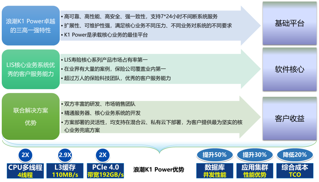 浪潮K1 Power平台拥有区别于X86平台的处理器架构,是专业性更强的技术架构。浪潮K1 Power基于RISC指令集,每个核心8线程,多线路多级高缓存,相比X86平台,在并发多线程任务处理后台业务能力方面,具备更加高效和稳定等特点,在长期使用中,能够满足保险企业客户对低维护、长期不停机运行的需求。