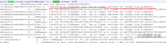 以上两张图可以看出,JobManager与Zookeeper之间的连接状态发生变更,由正常情况下的CONNECTED状态变成SUSPENDED/LOST。通过源码中查找上述红线日志,可以定位到
