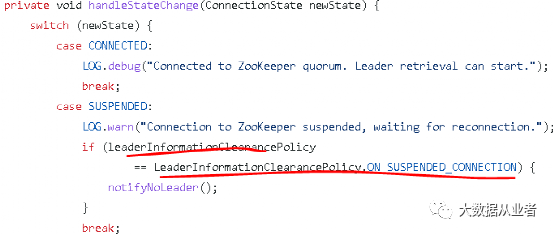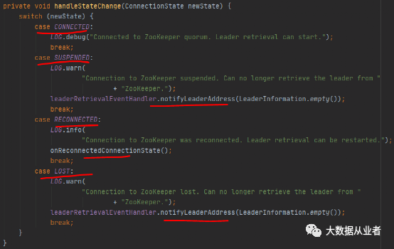 以上代码可以看出Flink处理Zookeper连接的四种状态(CONNECTED、SUSPENDED、RECONNECTED、LOST)。其中,SUSPENDED和LOST状态均被认为是连接不可用、主动触发Leader信息变更、主动重启task任务。
